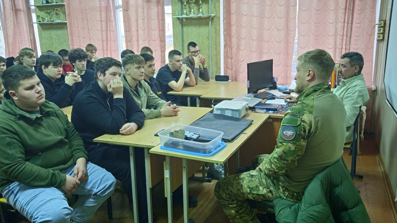 Встреча проходила в формате живой беседы. Студенты учебных групп 13 ГЭМ и 25 СП, которые присутствовали на встрече, спрашивали о суровых боевых буднях и о солдатском быте, о специфике работы военной техники, об испытаниях, с которыми они и их товарищи сталкиваются ежедневно, и о том, что помогает им не падать духом на передовой.